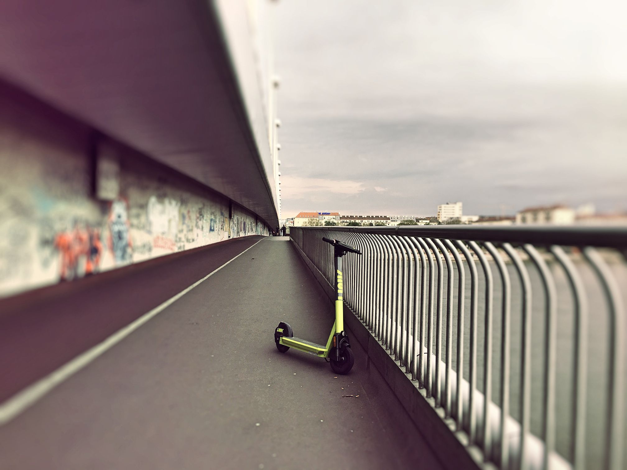 Ein auf einer Brücke abgestellter E-Scooter blockiert den Gehweg zwischen Radweg und dem Geländer der Brücke.