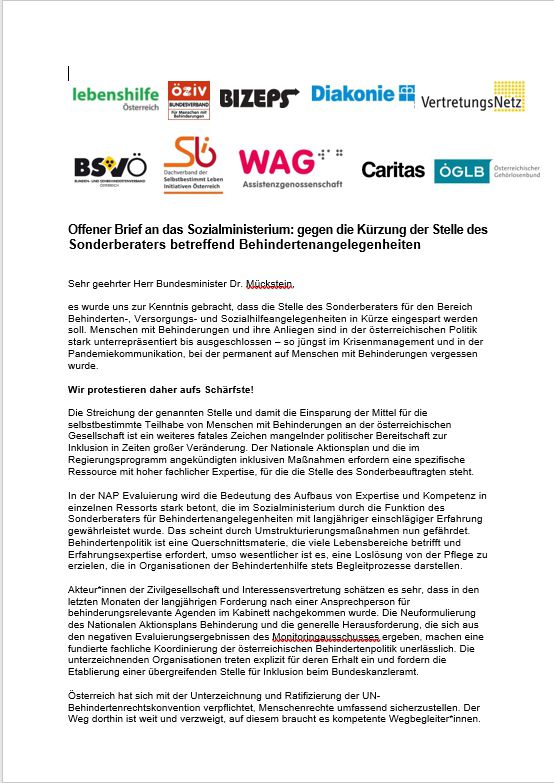 Der Brief, der am 31.5.2021 versendet wurde, wird von folgenden Organisationen unterstützt: Lebenshilfe Österreich, ÖZIV, Blinden- und Sehbehindertenverband Österreich, BIZEPS-Zentrum für Selbstbestimmtes Leben, Österreichischer Gehörlosenbund, WAG Assistenzgenossenschaft, Caritas, Diakonie und Vertretungsnetz)