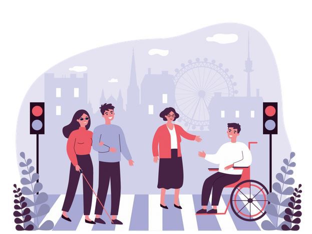 Menschen in Wien. Eine blinde Frau mit Taststock geht mit einem Mann über einen Zebrastreifen. Eine Frau spricht mit einem Mann im Rollstuhl