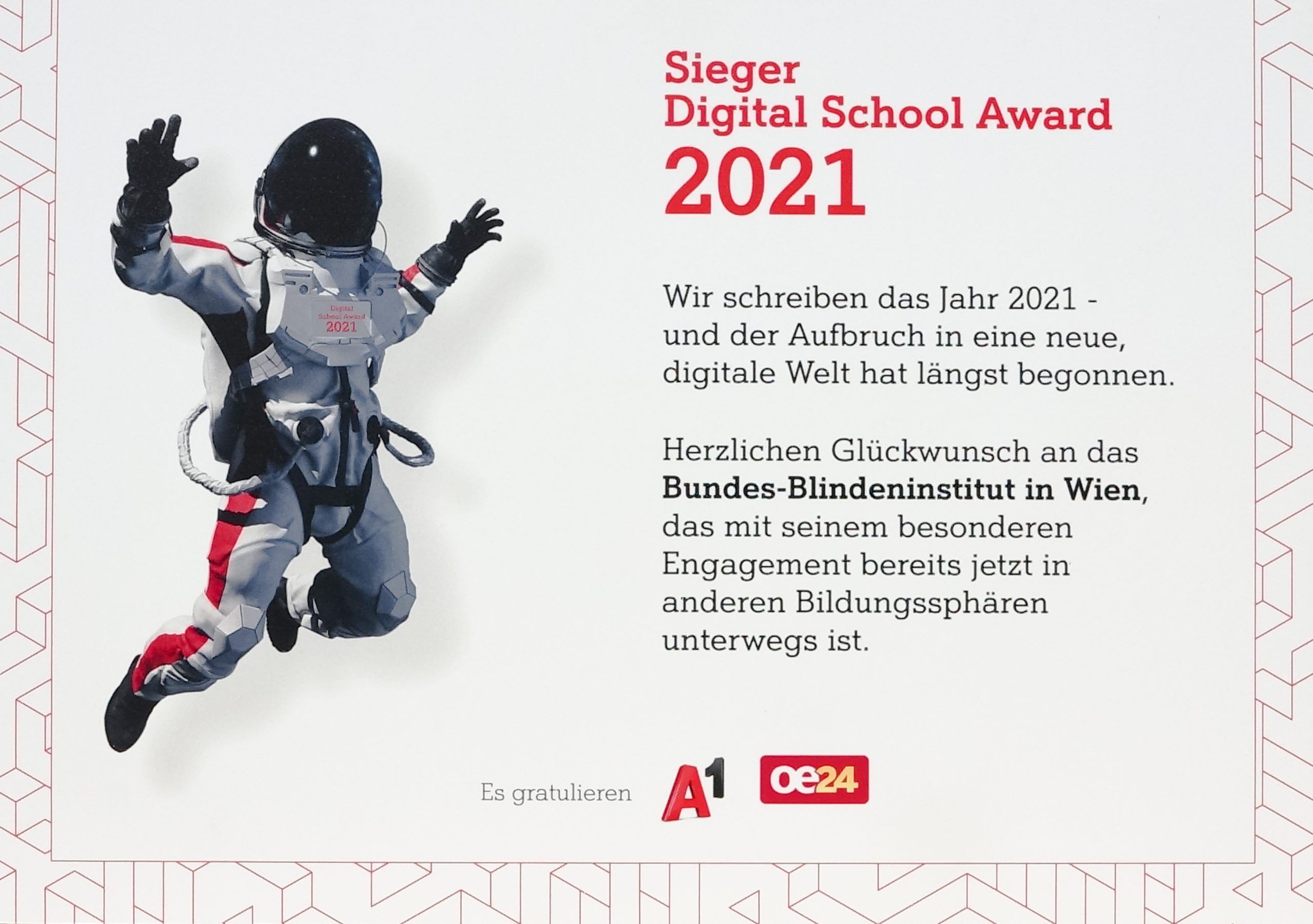 Auszeichnung. Text: „Sieger Digital School Award 2021“ Wir schreiben das Jahr 2021 - und der Aufbruch in eine neue, digitale Welt hat längst begonnen. - Herzlichen Glückwunsch an das Bundes-Blindeninstitut in Wien, das mit seinem besonderen Engagement bereits jetzt in anderen Bildungssphären unterwegs ist. Es gratulieren A1, oe24. Bild: Raumfahrer