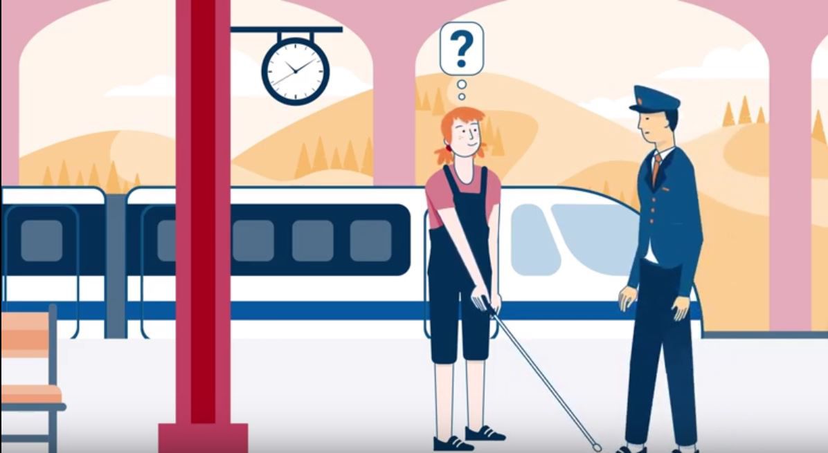 Dieses Video über die Umsetzung der Rechte blinder und sehbehinderter Menschen auf Zugang zu persönlicher Mobilität verwendet einfach gezeichnete Animationen und Text auf dem Bildschirm, um die verbale Botschaft zu veranschaulichen. Die Animation zeigt die Voraussetzungen, die erforderlich sind, wie z. B. Bahnhofshilfen und Lautsprecherdurchsagen, damit Menschen mit eingeschränktem Sehvermögen unabhängig und ohne Stress reisen können.