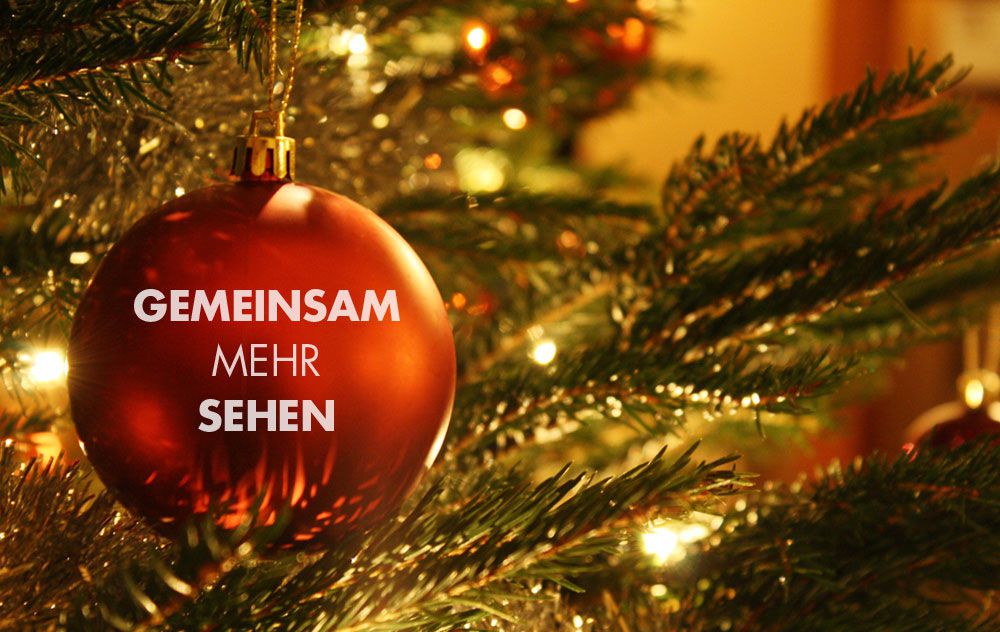Ein Tannenzweig mit einer roten Weihnachtskugel auf der zu lesen ist "Gemeinsam mehr Sehen"