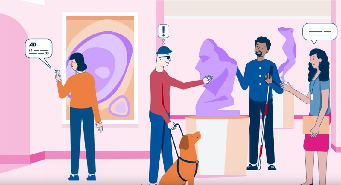 In einem Museum betätigt eine sehbehinderte Frau einen Knopf neben einem abstrakten Gemälde, um die Audiodeskription zum Werk zu hören. Lächelnd berührt ein junger Mann mit Führhund die Konturen einer großen Skulptur und ein Ausrufezeichen erscheint über seinem Kopf. Ein blinder Mann mit weißem Langstock berührt den Hinterkopf der Skulptur, während eine Museumsführerin über das Kunstwerk spricht.