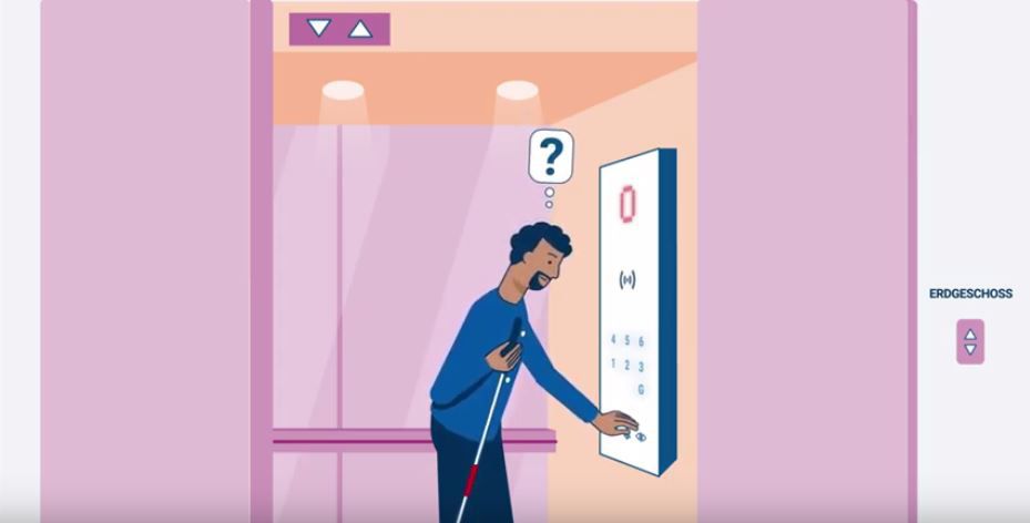 Screenshot des Sensibilisierungsvideos. Ein blinder Mann versucht im Aufzug den Knopf für das richtige Stockwerk zu ertasten. Über seinem Kopf erscheint ein Fragezeichen, denn der Lift ist nicht barrierefrei.