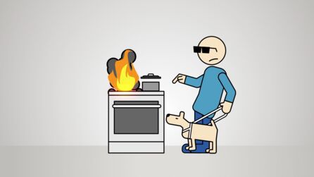 Grafik: Ein Mensch mit dunkler Brille und Blindenführhund steht erschrocken vor einem Herd. Eine Herdplatte brennt.