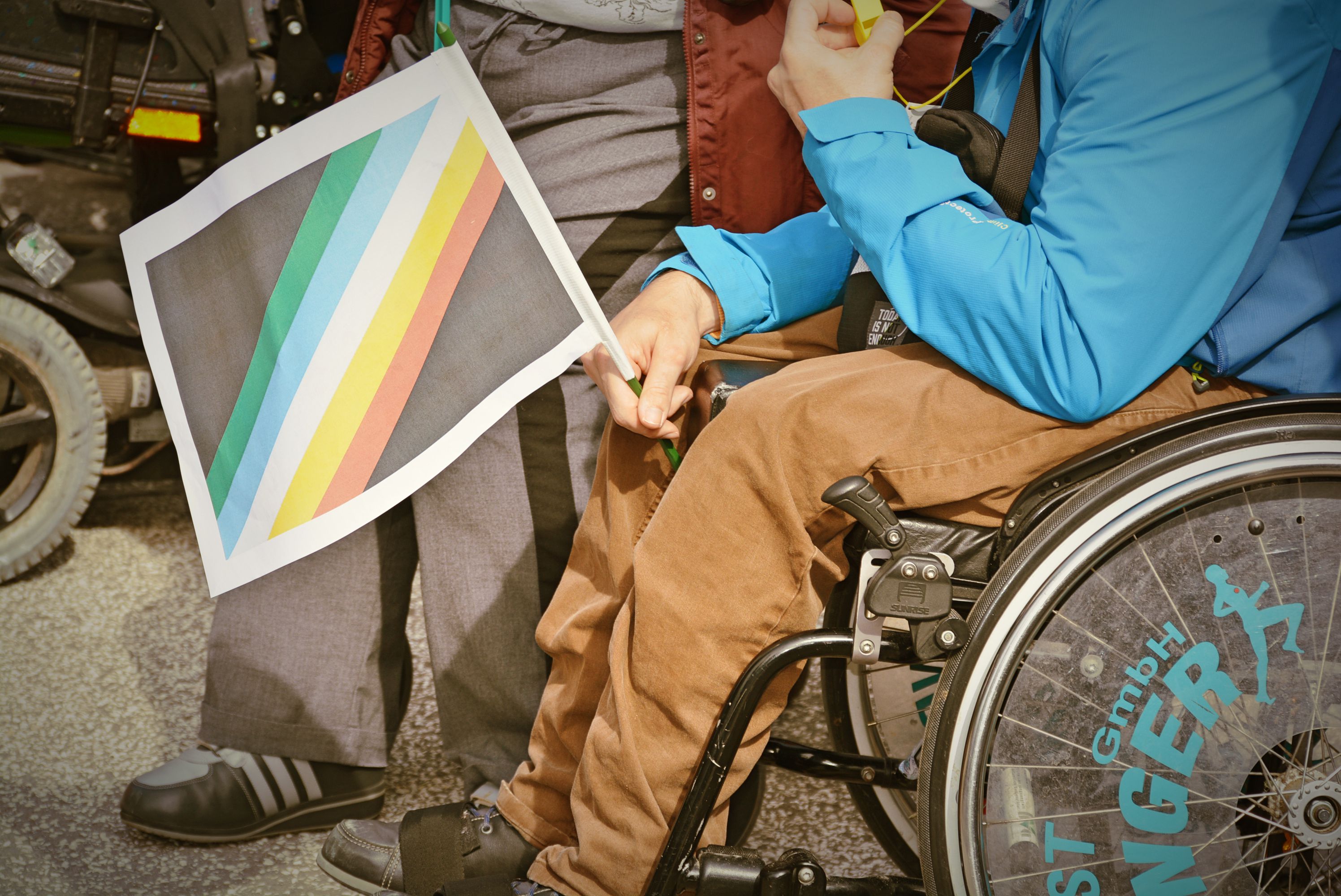 Ein Mensch im Rollstuhl hält in einer Hand die Disability Pride Flagge und in der anderen eine gelbe Trillerpfeife
