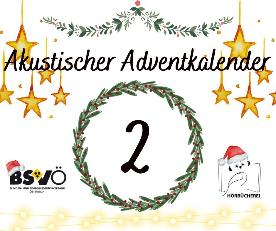 Bild: Akustischer Adventkalender. Logo des BSVÖ und der Hörbücherei, ein Kranz in dessen Mitte die jeweilige Zahl des Adventtages zu lesen ist. Goldgelbe Sterne rundherum.