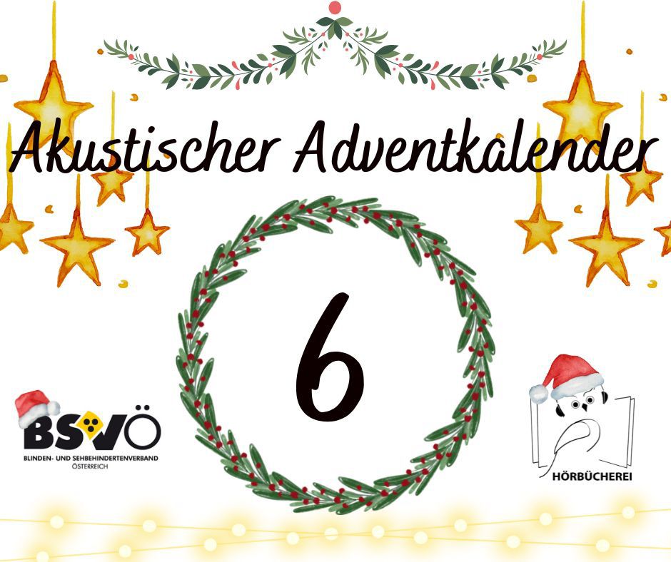 Akustischer Adventkalender. Logo des BSVÖ und der Hörbücherei, ein Kranz in dessen Mitte die jeweilige Zahl des Adventtages zu lesen ist. Goldgelbe Sterne rundherum.