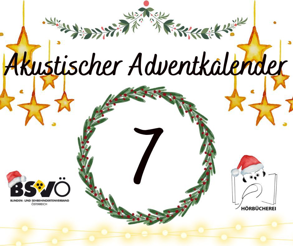 Akustischer Adventkalender. Logo des BSVÖ und der Hörbücherei, ein Kranz in dessen Mitte die jeweilige Zahl des Adventtages zu lesen ist. Goldgelbe Sterne rundherum.
