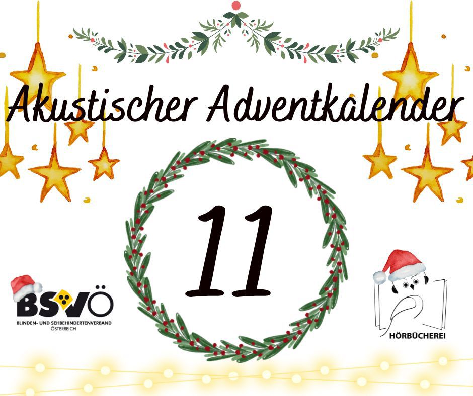 Akustischer Adventkalender. Logo des BSVÖ und der Hörbücherei, ein Kranz in dessen Mitte die jeweilige Zahl des Adventtages zu lesen ist. Goldgelbe Sterne rundherum.