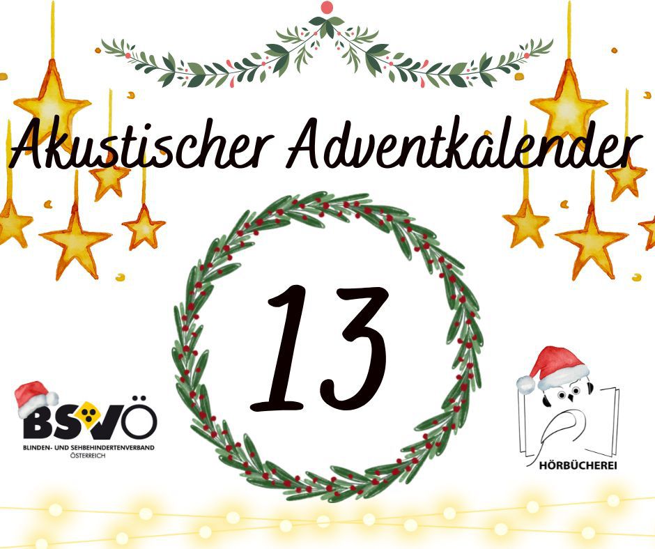 Akustischer Adventkalender. Logo des BSVÖ und der Hörbücherei, ein Kranz in dessen Mitte die jeweilige Zahl des Adventtages zu lesen ist. Goldgelbe Sterne rundherum.