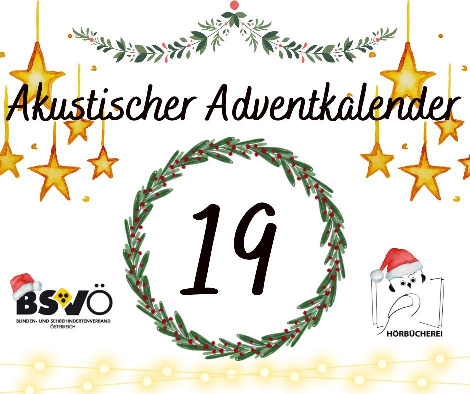 Akustischer Adventkalender. Logo des BSVÖ und der Hörbücherei, ein Kranz in dessen Mitte die jeweilige Zahl des Adventtages zu lesen ist. Goldgelbe Sterne rundherum.