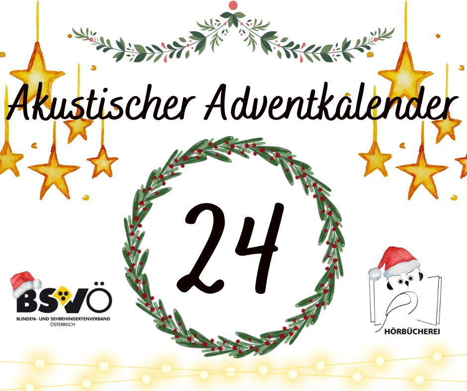 Akustischer Adventkalender. Logo des BSVÖ und der Hörbücherei, ein Kranz in dessen Mitte die jeweilige Zahl des Adventtages zu lesen ist. Goldgelbe Sterne rundherum.