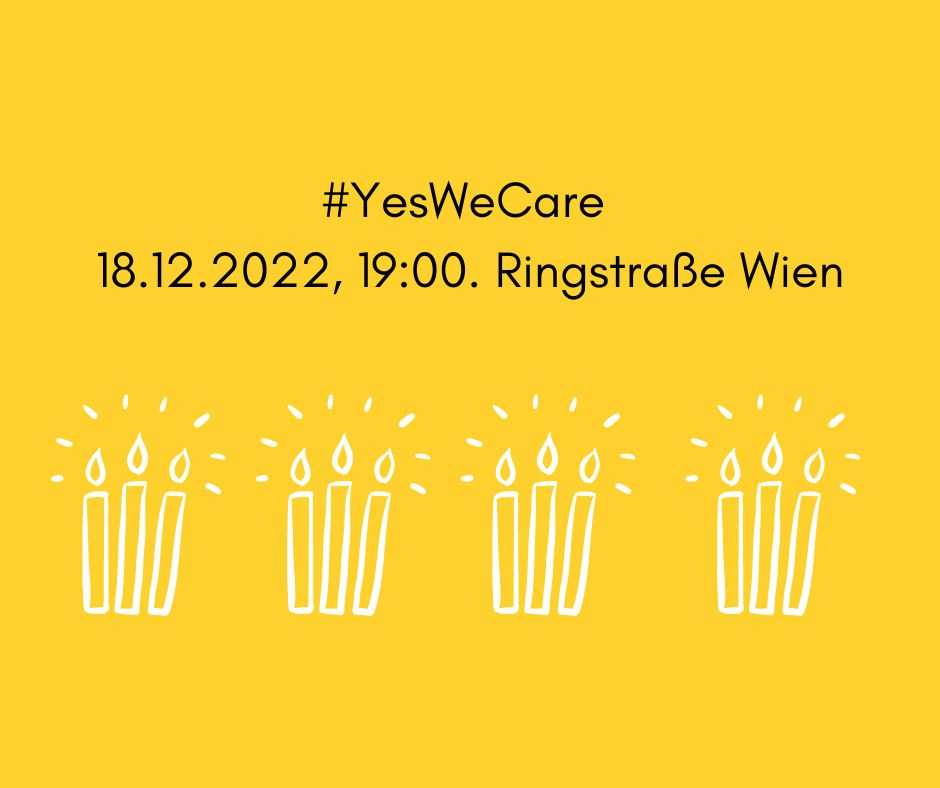 Gelber Hintergrund, eine Kette aus Kerzen. 'YesWeCare. 18.12.2022, 19:00. Wiener Ringstraße