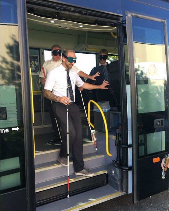 So wurden die Teilnehmer:innen selbst in die Situation versetzt, ohne zu sehen in einen Bus einzusteigen, einen Platz zu finden und sich ohne Sicht zu orientieren. Eine spannende Erfahrung für alle, die zu größerem Verstehen des Bedarfs blinder und sehbehinderter Fahrgäste führte. Die Sensibilisierung am eigenen Körper erfolgte aber erst nach einem ausführlichen Theorieteil, der den Teilnehmenden schon wichtige Informationen und Grundlagen mit auf den Weg gab.