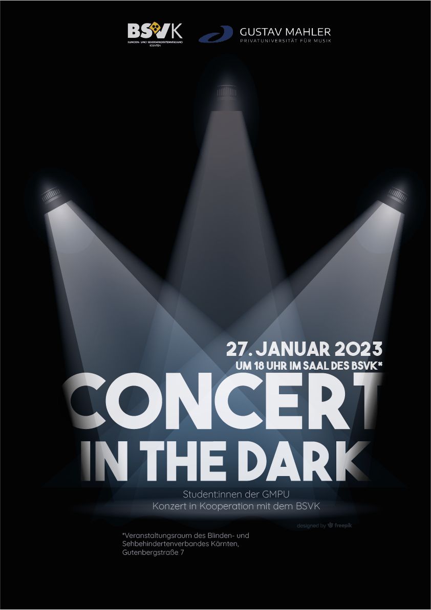 In Kooperation mit der Gustav-Mahler-Universität wird am 27.1. 2023 ein besonderes Konzert aufgeführt: Beim „Concert In The Dark“ geben Studierende des GMPU einen Einblick in ihr Talent!
