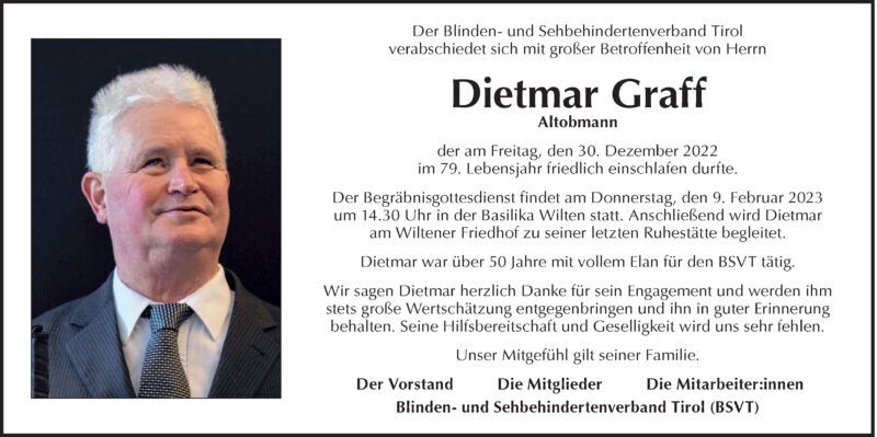 Dietmar Graff, Altobmann des Blinden- und Sehbehindertenverbandes Tirol (BSVT) ist am 30. Dezember 2022 friedlich entschlafen.