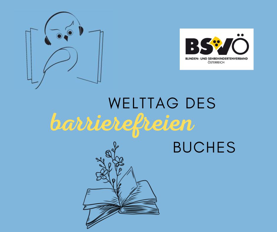 Logo Hörbücherei, Logo BSVÖ, "Welttag des barrierefreien Buches" Grafik eines offenen Buches.
