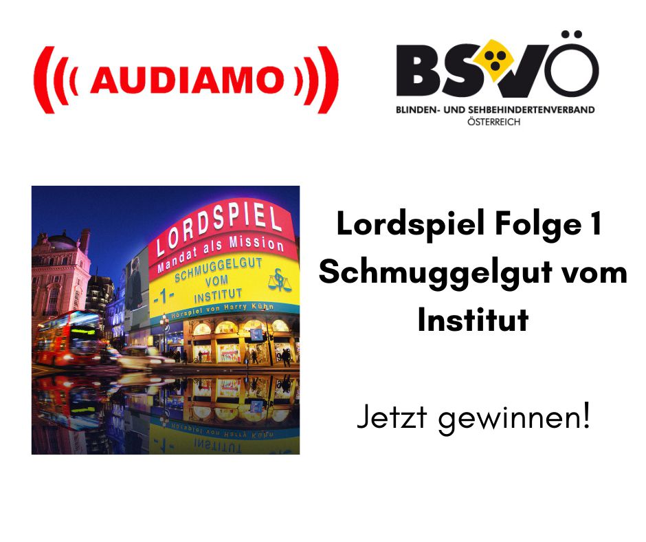 Logo Audiamo, Logo BSVÖ, "Lordspiel Folge 1 – Schmuggelgut vom Institut“ "Jetzt gewinnen"