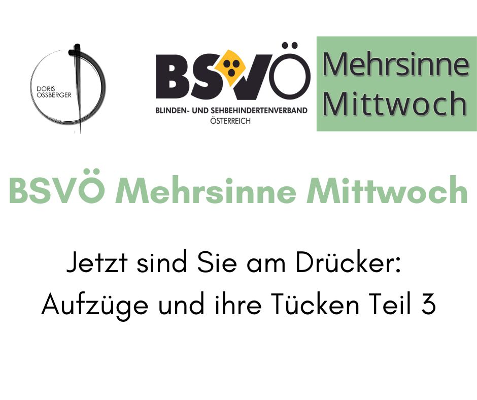 Logo Doris Ossberger Wortklaviatur.at, Logo BSVÖ, "BSVÖ Mehrsinne Mittwoch Jetzt sind Sie am Drücker: Aufzüge und ihre Tücken Teil 3"
