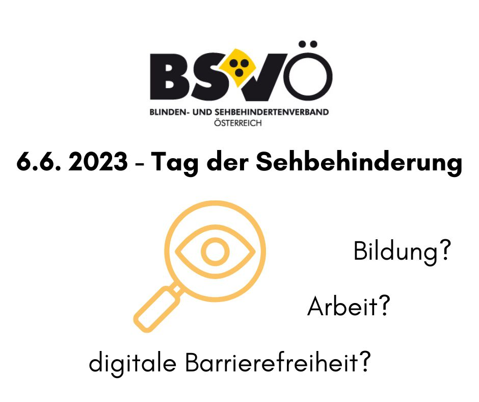 Logo BSVÖ "Tag der Sehebehinderung" Grafik eines Auges hinter einer Lupe. "Bildung?", "Arbeit?", "digitale Barrierefreiheit?"