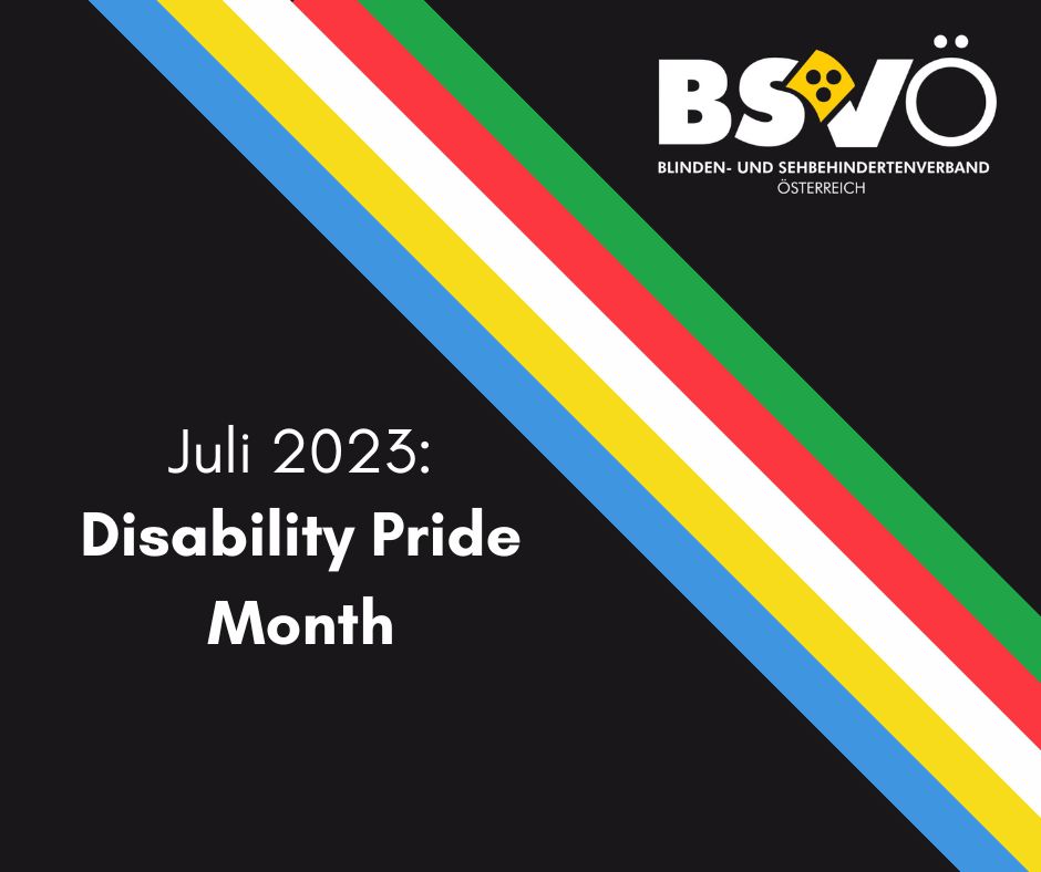 Schwarzer Hintergrund, Logo des BSVÖ, Farben der Disability Flagge quer durch das Bild (grün, rot, weiß, gelb, blau) "Juli 2023: Disability Pride Month"