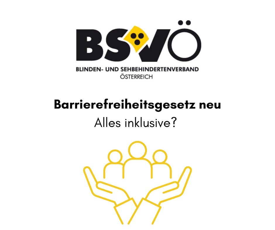 Logo BSVÖ, "Alles inklusive? Neues Barrierefreiheitsgesetz beschlossen". Grafik zweier Hände, die eine Gruppe an Menschen umschließen