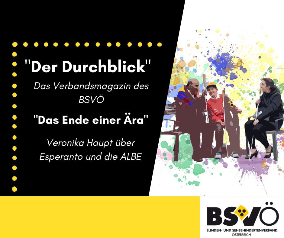 "Der Durchblick. Das Verbandsmagazin des BSVÖ" "Das Ende einer Ära" Veronika Haupt über Esperanto und die ALBE. Cover des aktuellen Magazins.
