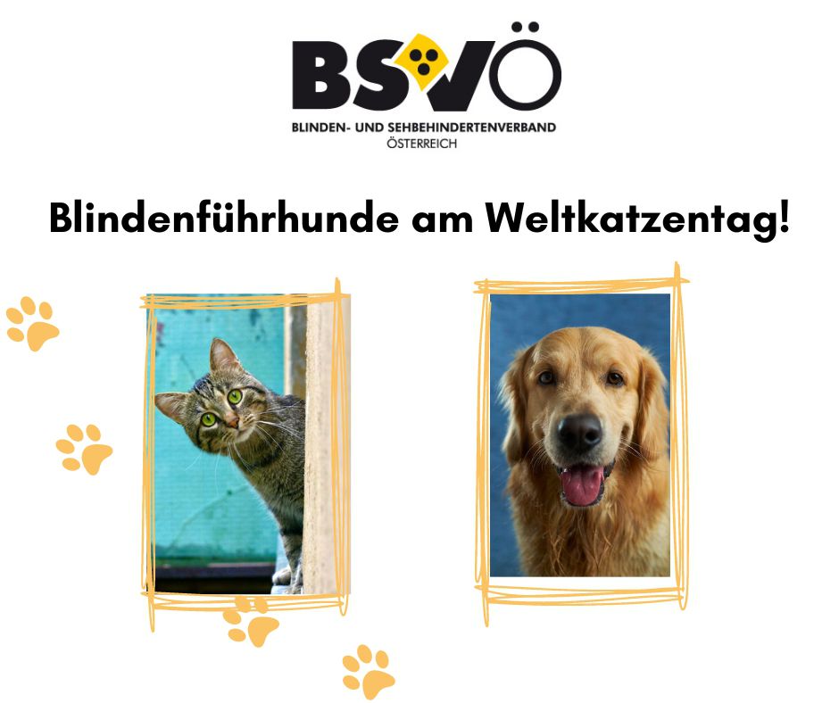 Logo BSVÖ, "Blindenführhunde am Weltkatzentag!" Bild einer Katze, Bild eines Hundes in einem gelben Rahmen.