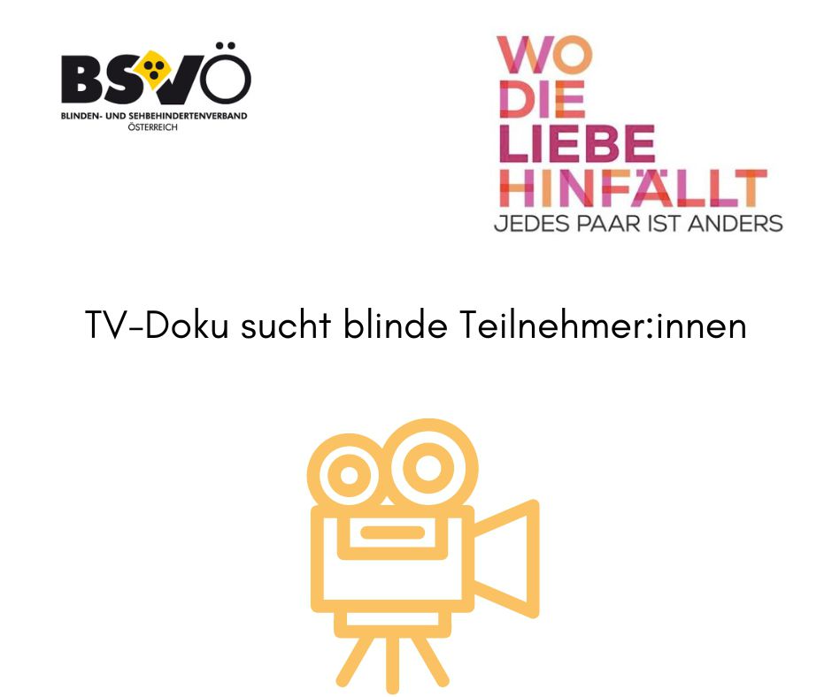 Logo BSVÖ, Logo "Wo die Liebe hinfällt", "TV-Doku sucht blinde Teilnehmer:innen", Grafik einer Filmkamera.