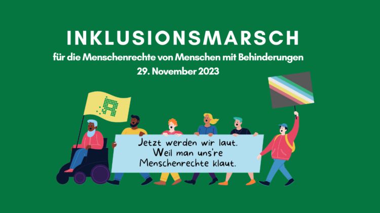 Grünes Rechteck. Darauf ist eine Illustration demonstrierender Menschen mit Behinderungen abgebildet. Eine Person hält die Disability-Flagge, eine weitere ein Schild mit dem Logo des Österreichischen Behindertenrats. Dazu folgender Text: Inklusionsmarsch. Für die Menschenrechte von Menschen mit Behinderungen 29. November 2023. Jetzt werden wir laut. Weil man uns're Menschenrechte klaut.