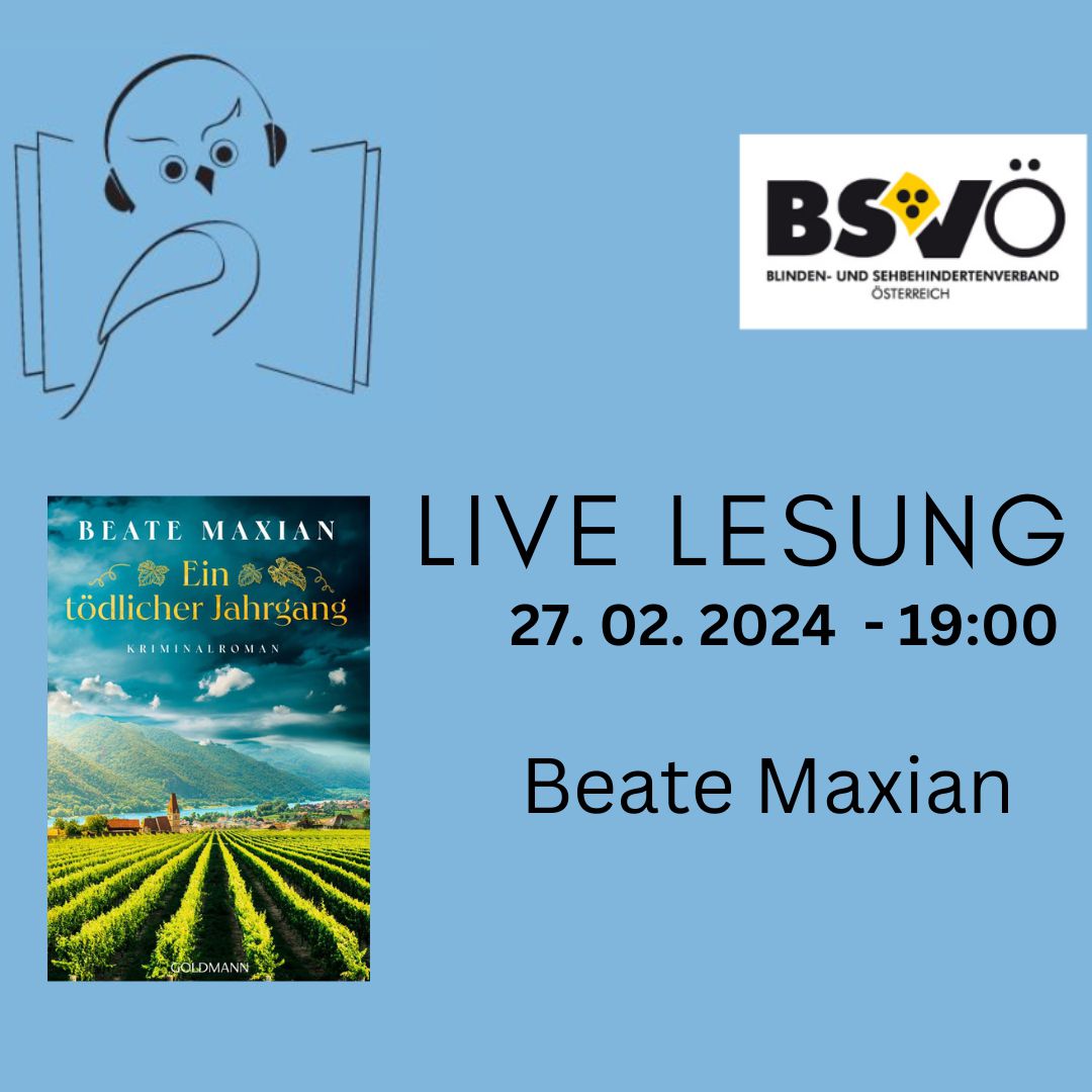 Logo Hörbücherei des BSVÖ, Live Lesung am 27.2.2024 mit Beate Maxian. Buchcover: "Ein tödlicher Jahrgang".