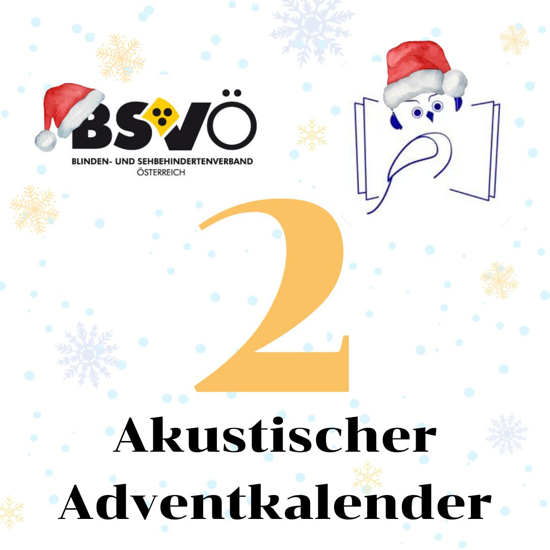 Akustischer Adventkalender. Logo BSVÖ, Logo Hörbücherei, Schneeflocken im Hintergrund