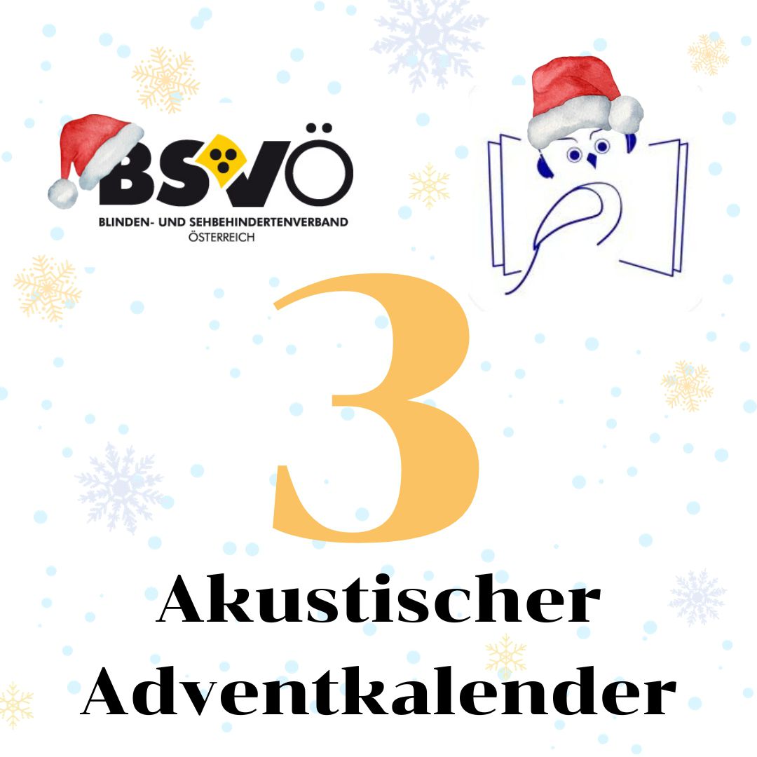 Akustischer Adventkalender. Logo BSVÖ, Logo Hörbücherei, Schneeflocken im Hintergrund