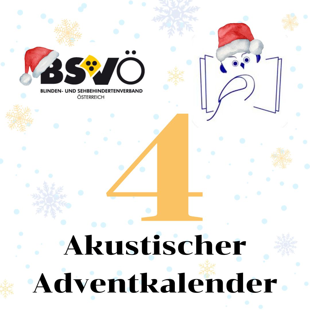 Akustischer Adventkalender. Logo BSVÖ, Logo Hörbücherei, Schneeflocken im Hintergrund