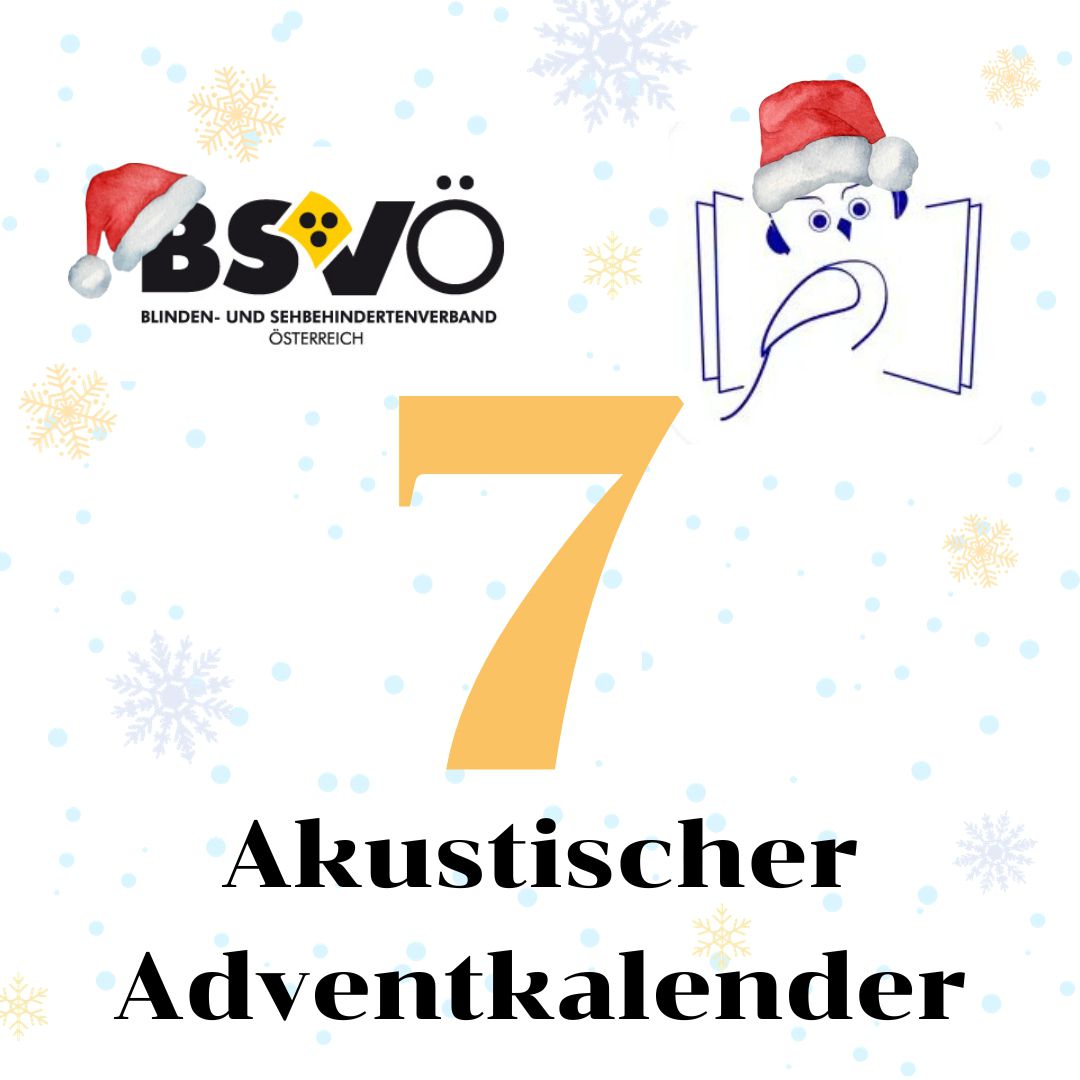 Akustischer Adventkalender. Logo BSVÖ, Logo Hörbücherei, Schneeflocken im Hintergrund