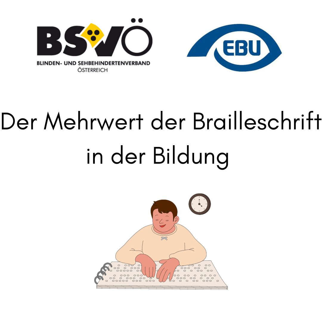 Logog BSVÖ und EBU "Der Mehrwert der Brailleschrift in der Bildung". Grafik eines Kindes das Braille liest.