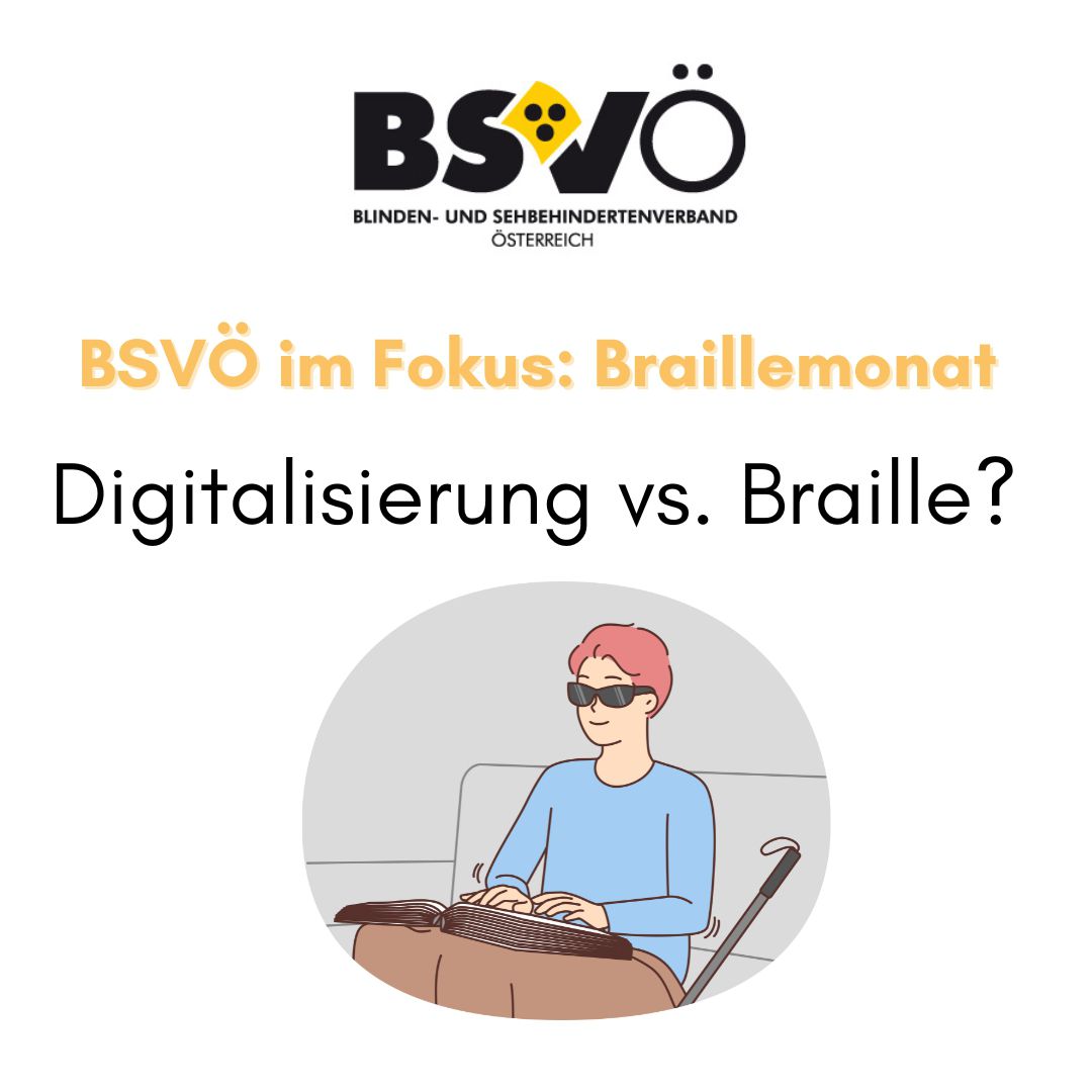 Logo BSVÖ Braillemonat "Digitalisierung vs. Braille?" Grafik eines Menschen, der Braille liest.