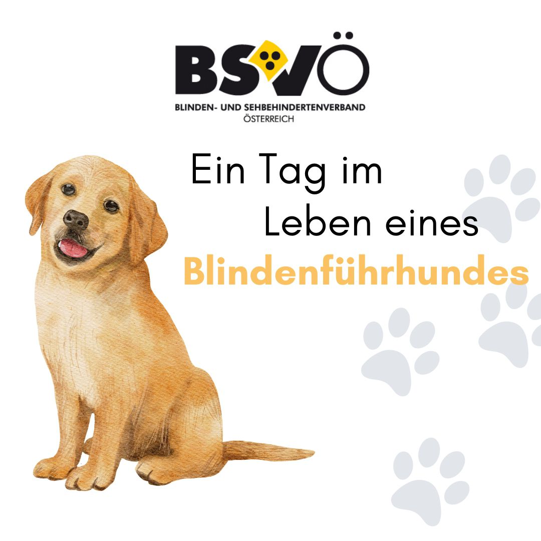 "Ein Tag im Leben eines Blindenführhundes" Logo BSVÖ, Grafik eines Retriever-Welpens.