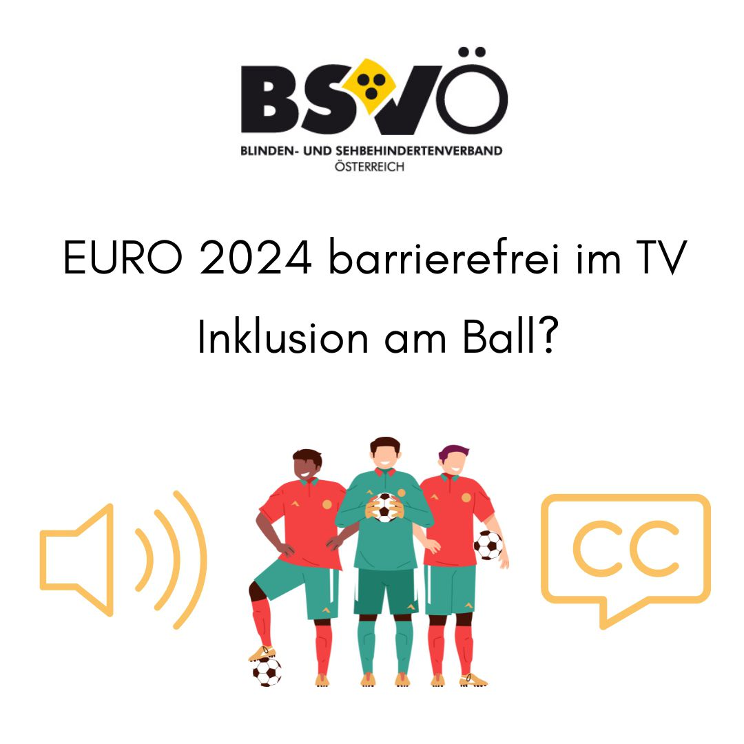 "EURO 2024 barrierefrei im TV. Inklusion am Ball?" Logo BSVÖ, Grafik Audio, Grafik Untertitle, Grafik von einer Gruppe an Fußballern.