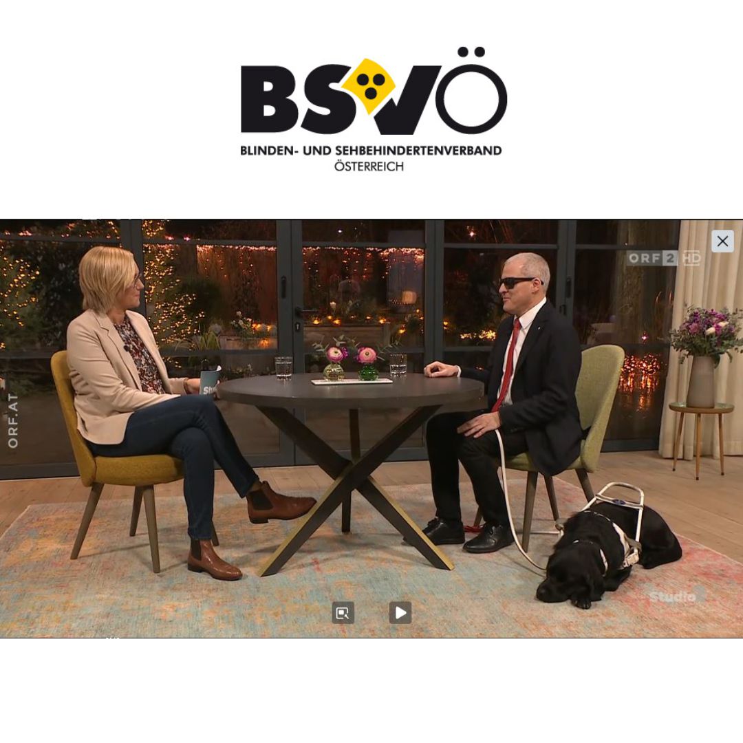 Zum Tag der Blindenführhunde war Dr. Markus Wolf, Präsident des Österreichischen Blinden- und Sehbehindertenverbandes Österreich zu Gast in der ORF Magazinsendung STUDIO 2. Natürlich war auch seine Blindenführhündin Chilly, eine schwarze Retriever-Dame, mit dabei. Schließlich ging es um sie und um ihre Kolleg:innen