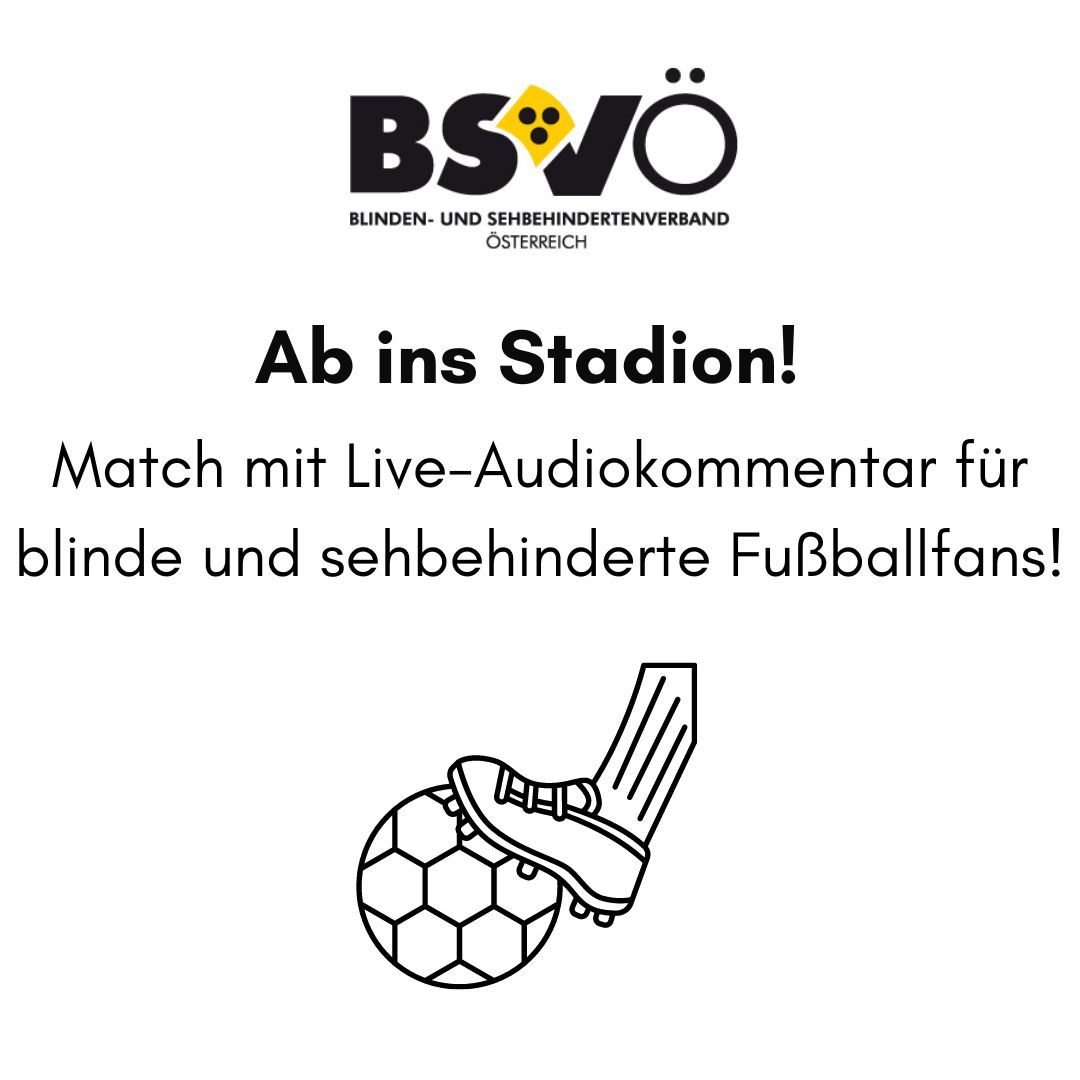 Logo BSVÖ, Match mit Live-Audiokommentar für blinde und sehbehinderte Fußballfans! Grafik eines Fußballs mit Spielerfuß.