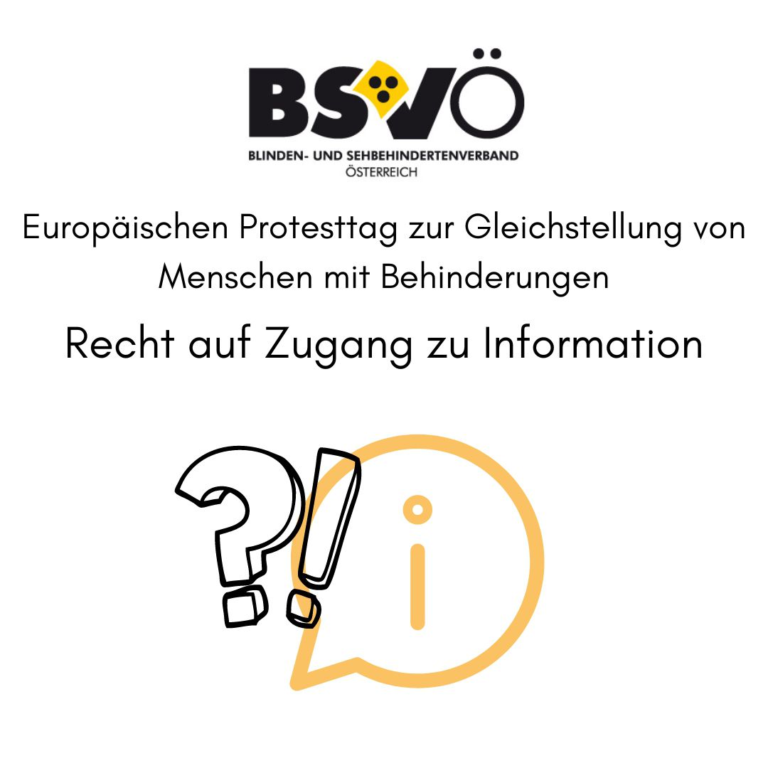 "Europäischen Protesttag zur Gleichstellung von Menschen mit Behinderungen, Recht auf Zugang zu Information " Logo BSVÖ, Grafik eines Info-Symbols