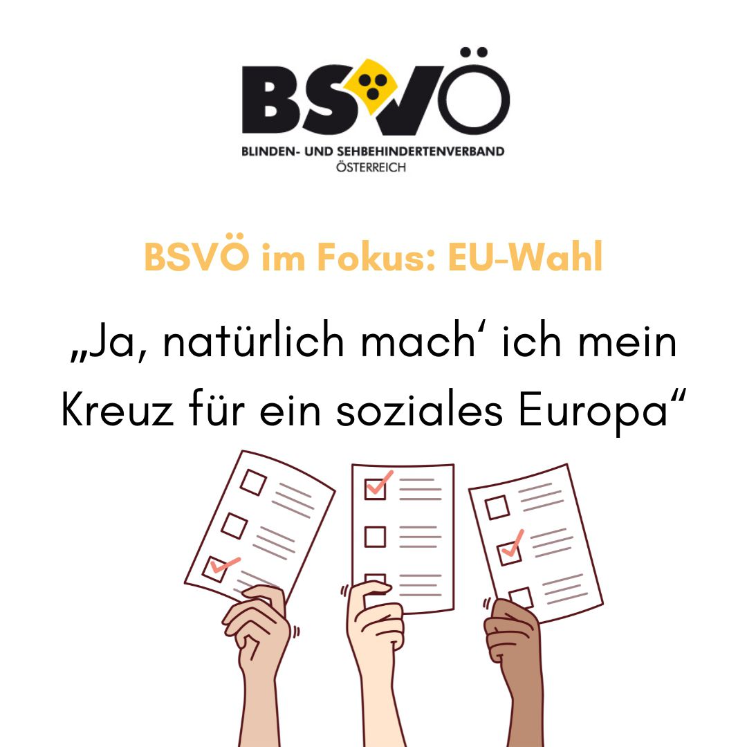 BSVÖ im Fokus: EU-Wahl „Ja, natürlich mach‘ ich mein Kreuz für ein soziales Europa" Grafik von Händen mit Stimmzetteln.