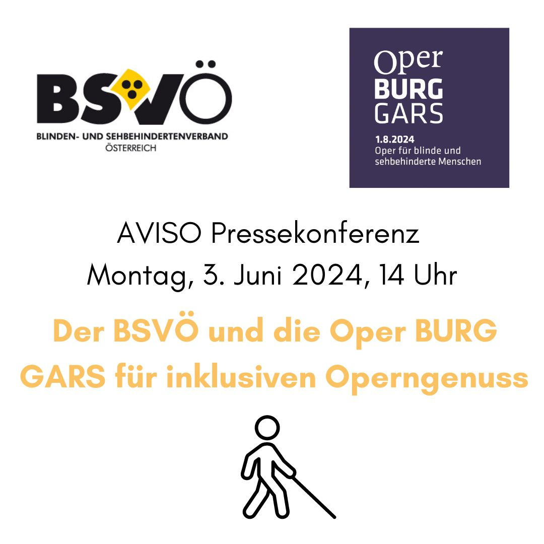 "AVISO Pressekonferenz: Montag, 3. Juni 2024, 14 Uhr, Der BSVÖ und die Oper BURG GARS für inklusiven Operngenuss " Logo BSVÖ, Logo Oper Burg Gars.
