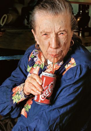 Eine Frau, tiefe Falten im Gesicht und Goldcreolen an den Ohren, die Haare grau meliert und zu einem Pferdeschwanz gebunden, blickt direkt in die Kamera und trinkt mit einem dünnen Strohhalm aus einer Coca Cola-Dose. Zum Rot der Dose steht das kräftige Blau der Bluse als Komplementärfarbe. In ihrem Ausdruck liegt etwas Rebellisches, gleichzeitig scheint sie den Beobachter hinter der Bildebene abzuschätzen.