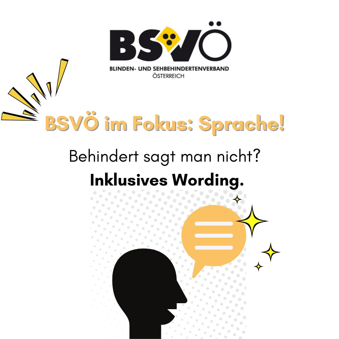 Text: BSVÖ Fokus Sprache! Behindert sagt man nicht? Inklusives Wording. Grafik eines sprechenden Menschen