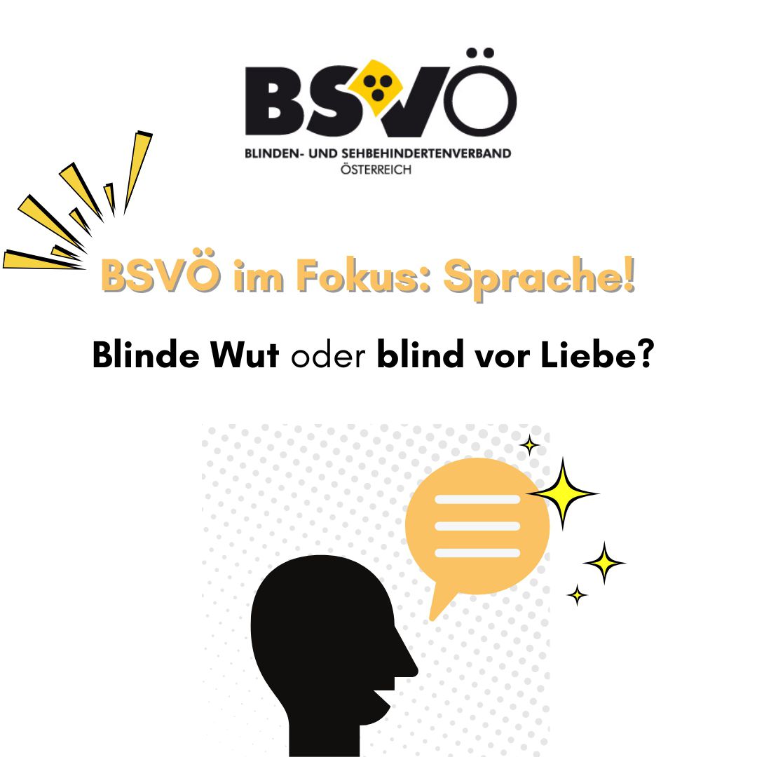 Text: BSVÖ Fokus Sprache! Blinde Wut oder blind vor Liebe? Grafik eines sprechenden Menschen