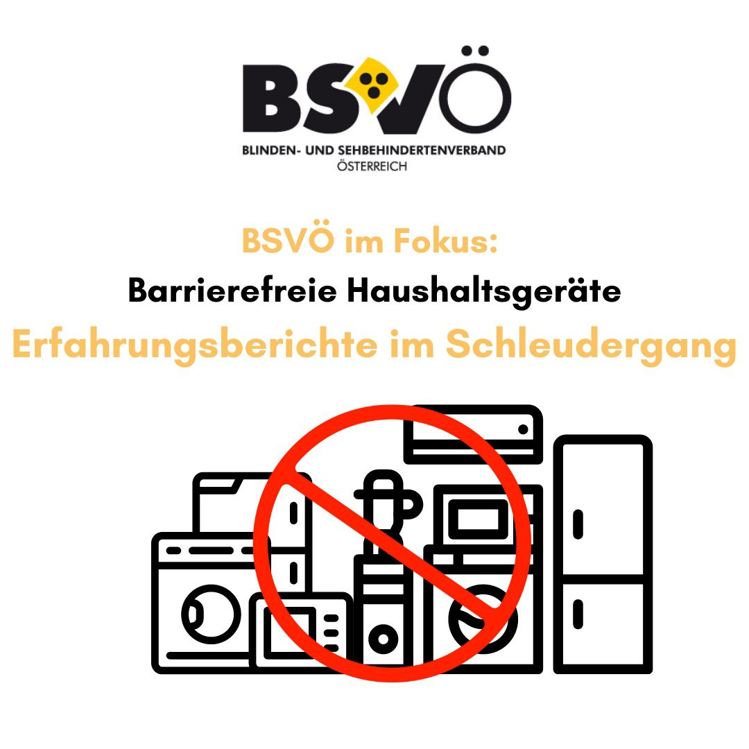 BSVÖ im Fokus Barrierefreie Haushaltsgeräte! Erfahrungsberichte im Schleudergang. Grafik verschiedener Hausgaltsgeräte, rot gerahmt und durchgestrichen.