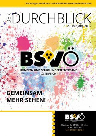 Cover des Magazins: Der Durchblick, darunter auf einem Bett aus bunten Farbspritzern das Logo des Verbandes: BSVÖ, in dem Schwung des "V" ist die gelbe Dreipunktschleife eingearbeitet. Unterhalb ist das Motto "Gemeinsam mehr sehen!" zu lesen.